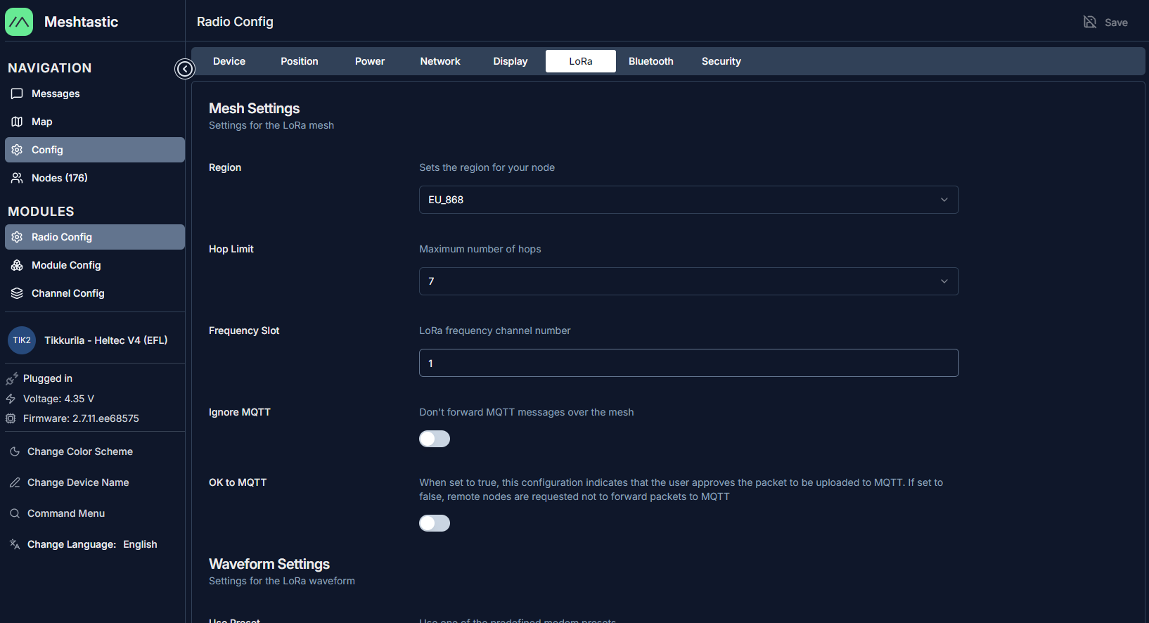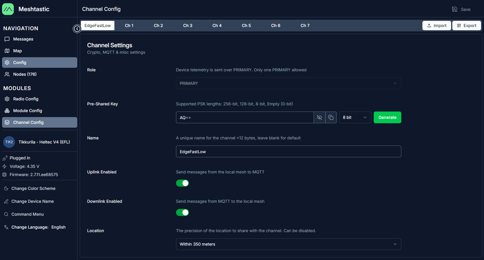 - Avaa Channel Config asetukset ja valitse LongFast kanava.