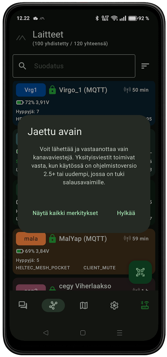 Laitteen poistamisesta ei tapahdu mitään peruuttamatonta, koska se ilmestyy automaattisesti takaisin listalle kun se seuraavan kerran lähettää itsestään tietoa meshtastic-verkkoon.