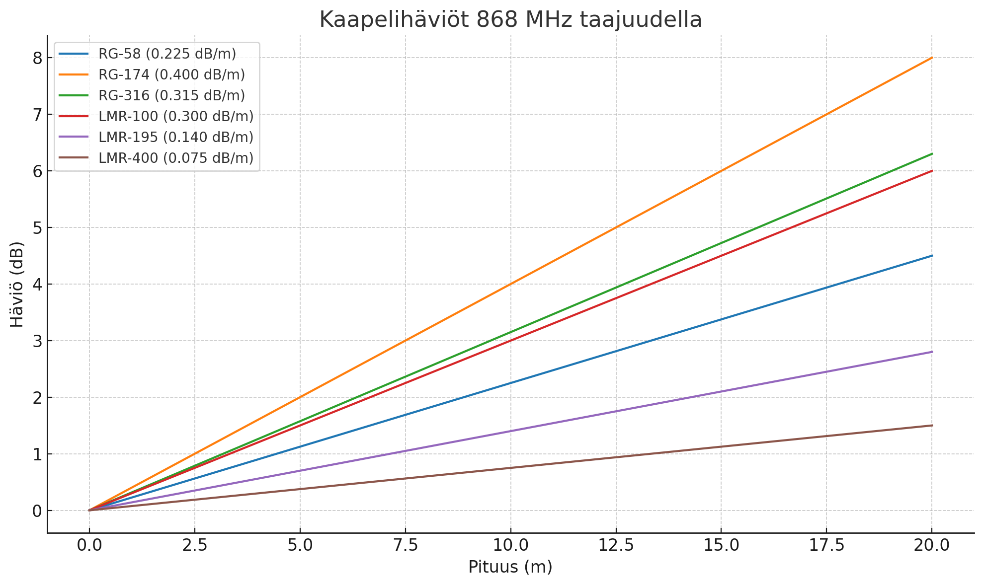 - RG-174 kaapelin häviö 868 MHz taajuudella on noin 1,5 dB/metri.