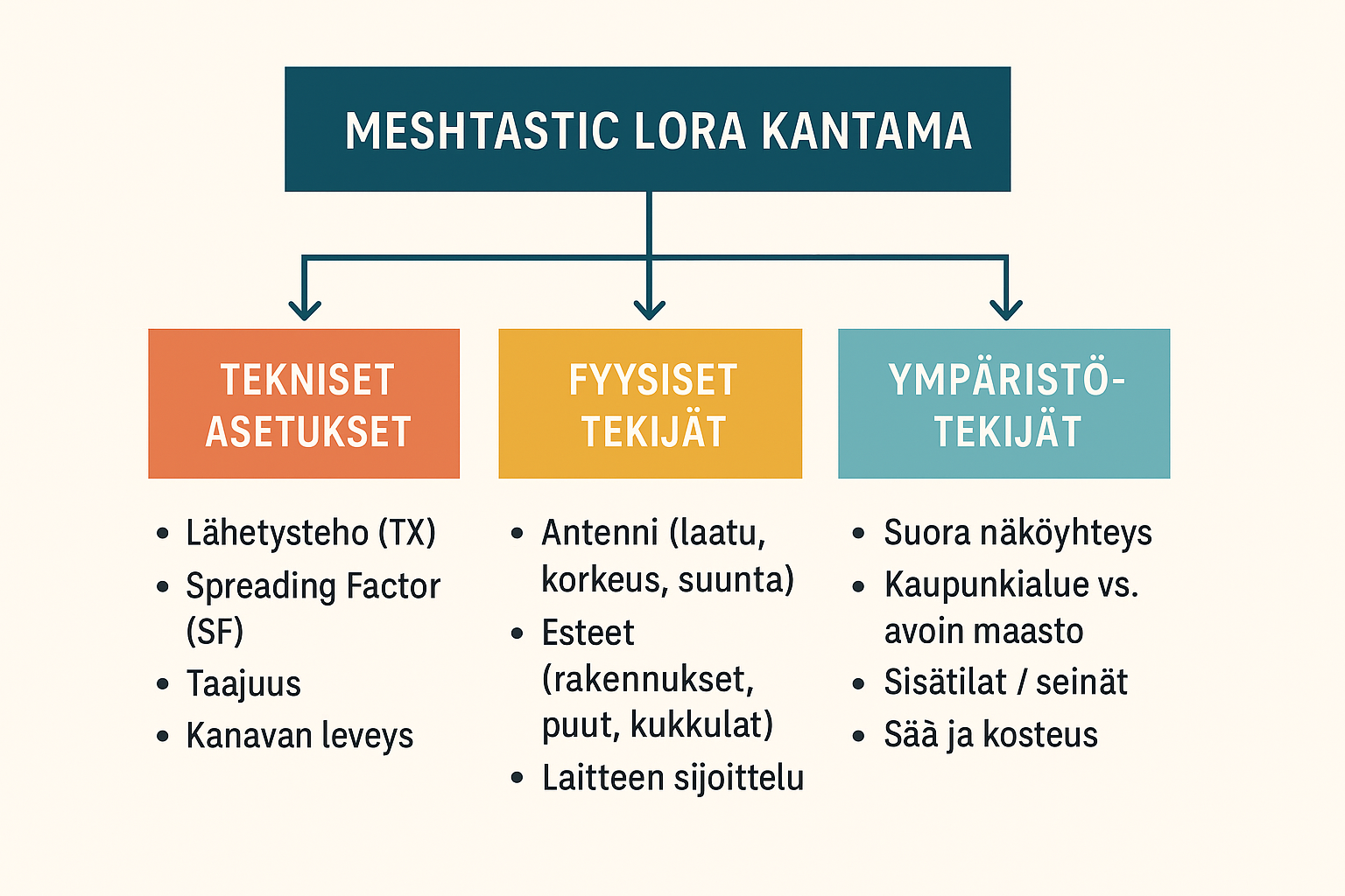 - Häiriöt: Muut laitteet, jotka käyttävät samoja radiotaajuuksia, voivat heikentää Meshtastic-kantamaa. Kaupunkiympäristöissä on yleensä enemmän radiomelua kuin maaseudulla.