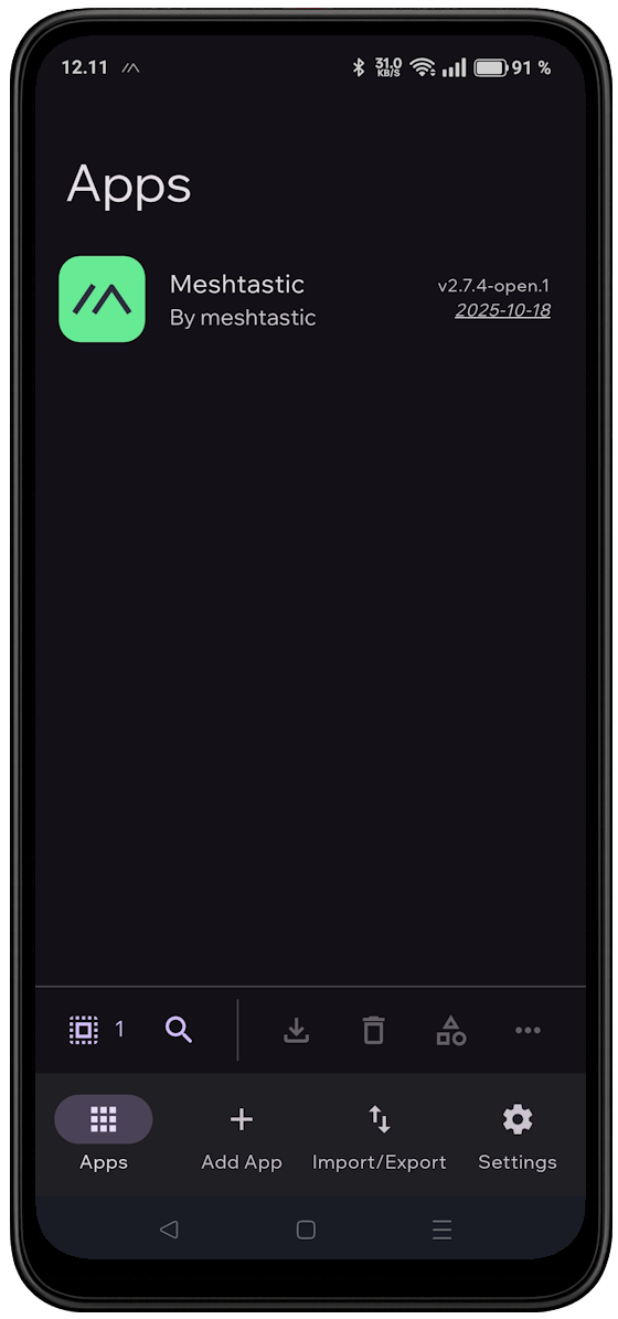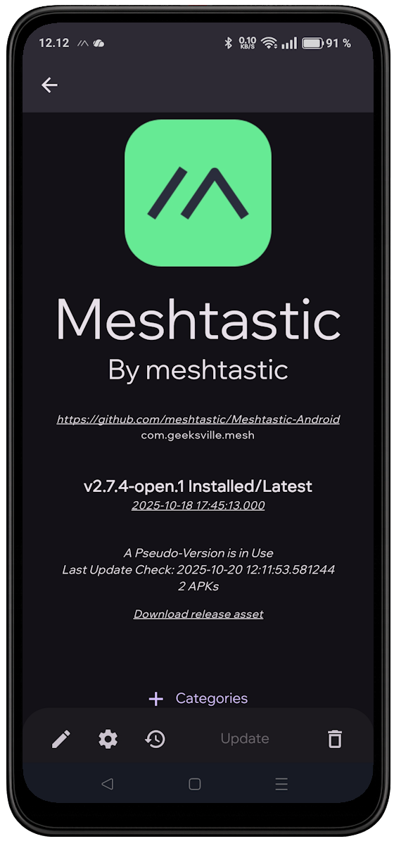 - Nyt päätelaitteessasi on viimeisin version Meshtastic sovelluksesta ja voit jatkossa päivittää sovelluksen helposti Obtainiumin kautta.